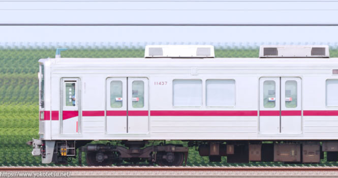 中間運転台部分に外幌を設置しスカートを撤去した半固定化改造を受けた、東武10030系11437F+11435F編成海側の長編成サイドビューです。