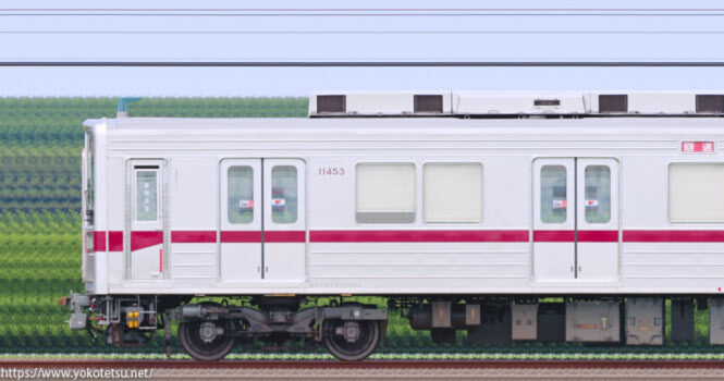 リニューアル前の11453F編成と、リニューアル編成の11432F編成の海側の長編成サイドビューです。