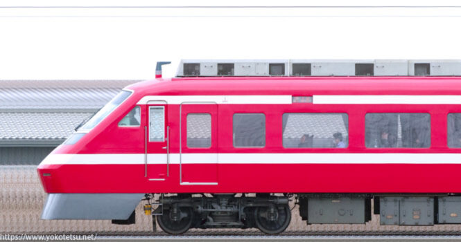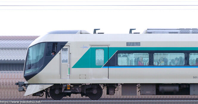 荷物室が後付けで設置された東武鉄道500系501F編成山側の長編成サイドビューです。