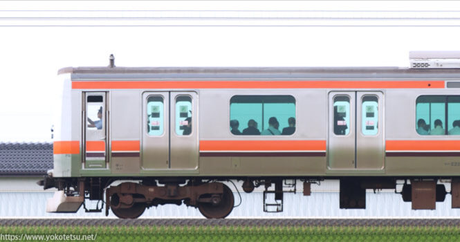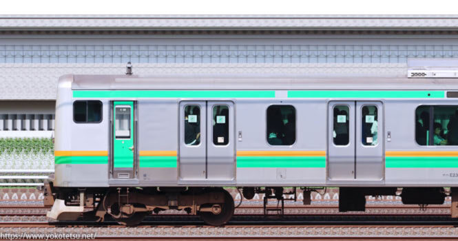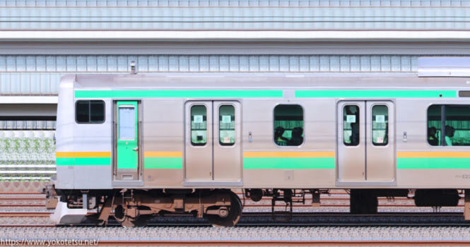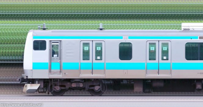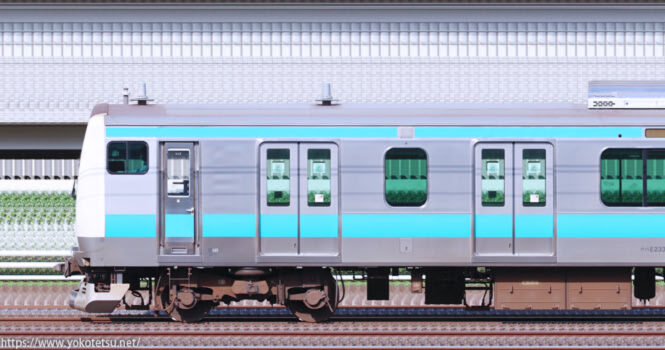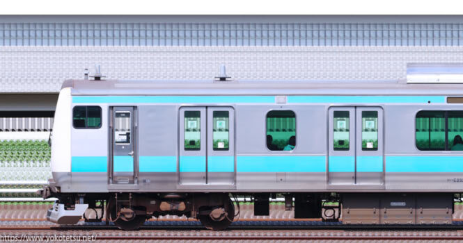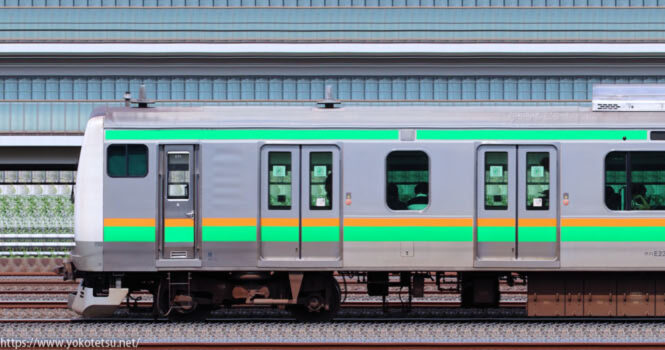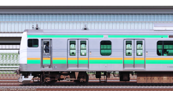 田町から転入した編成と当初から国府津所属編成が併結した国府津車両センターE233系E71編成+E02編成山側の長編成サイドビューです。