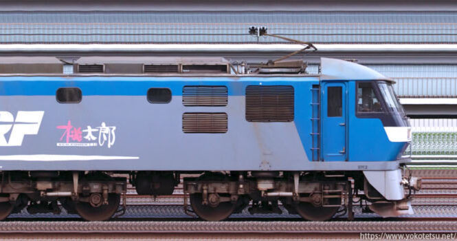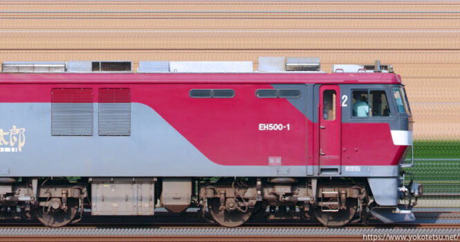 EH500形の中でも2両のみの存在する1次形であるEH500-1(公式側)が牽引するコンテナ列車の長編成サイドビューです。