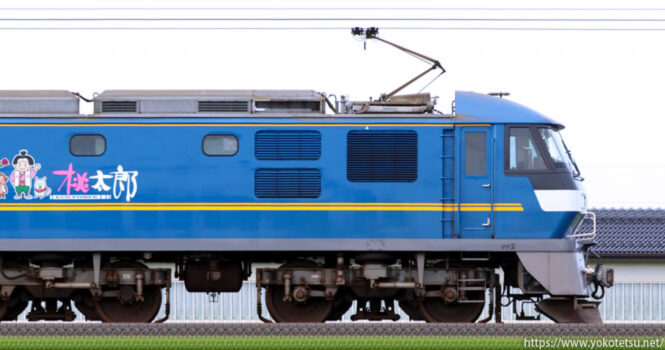 瀬野八間の勾配後押機関車の置換えを目的としつつ、本務機としての運用も考慮して設計されたEF210-300番台が牽引する石油タンク列車の長編成サイドビューです。