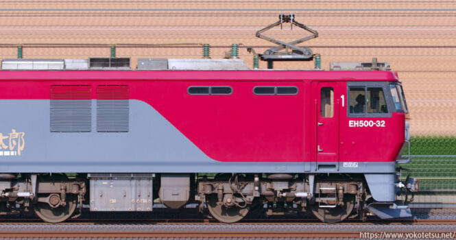 EH500形の中でも大多数の3次形であるEH500-32(非公式側)が牽引するコンテナ列車の長編成サイドビューです。