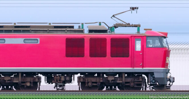 先行量産機であるEF510-1(公式側)が牽引するコンテナ列車の長編成サイドビューです。